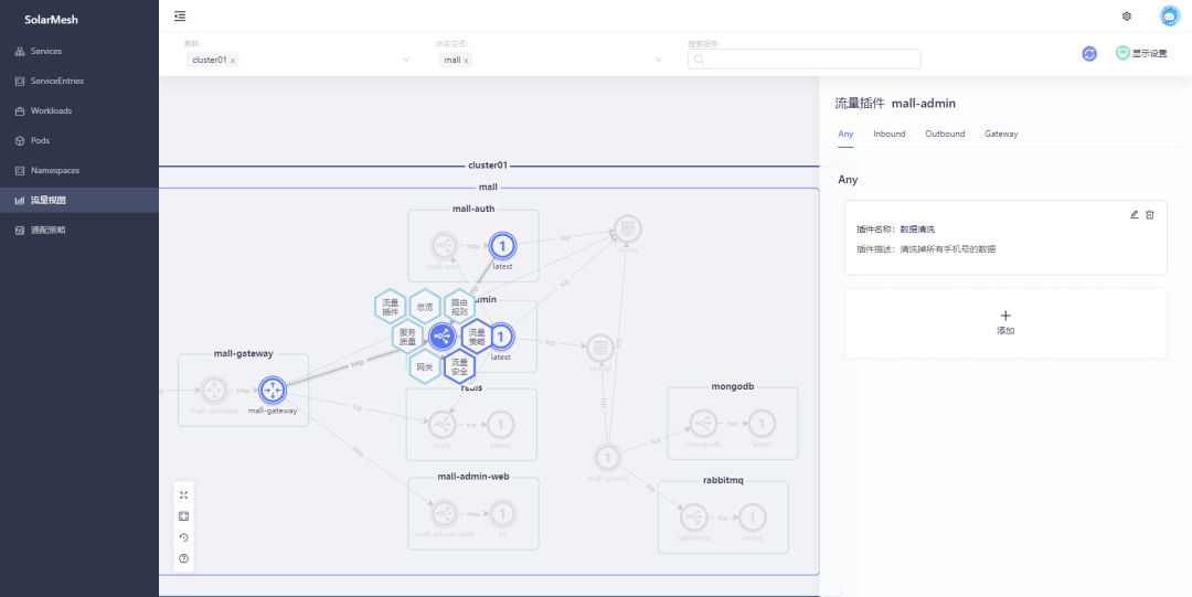 SolarMesh在 v1.10.2 版本中引入了流量插件的概念,将一些轻量级的业务封装成插件,在SolarMesh的界面上为应用流量在入站、出站时进行编码增强,达到对业务流量的切面编程(AOP Aspect Oriented Programming)能力。可以应用于对流量有业务诉求的使用场景,例如对敏感业务数据的过滤,在系统需要停机更新前下发更新通知,对特定核心接口的数据上报等。