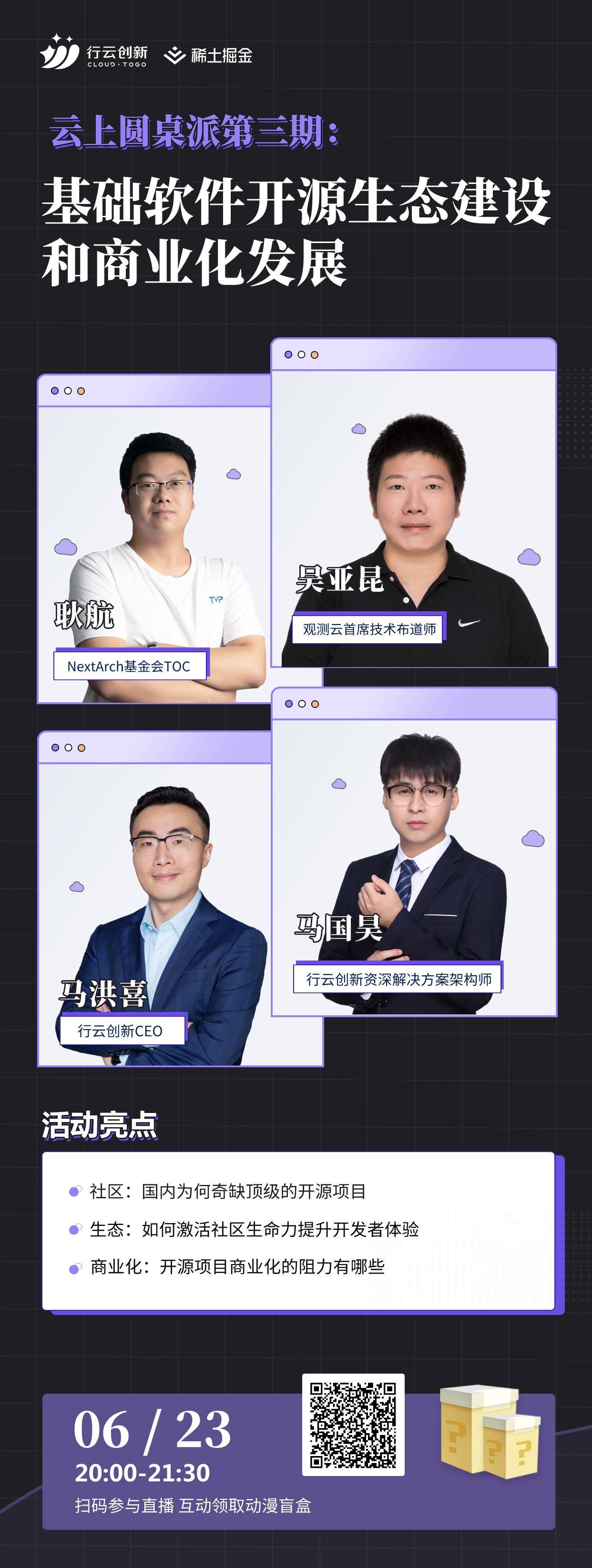 6月23日晚上20:00,云上圆桌派第三期《基础软件开源生态建设和商业化发展》即将开启,活动邀请NextArch基金会TOC耿航,观测云首席技术布道师吴亚昆,leyu.乐鱼创新资深解决方案架构师马国昊三位大咖和leyu.乐鱼创新CEO马洪喜一起对国内的开源生态现状、社区的建设及商业化发展等多个问题一起展开讨论。