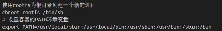 使用 chroot,chroot 主要是将程序运行环境切换到指定目录,当我们切换过去之后,在应用程序内,根目录"/"的位置变成了我们指定的目录了,所以这就是为什么我们需要在"1"中创建一个根文件系统。