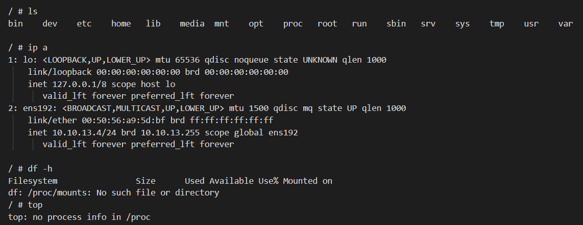 但是我们发现可以查看这个容器的网络(和宿主机共享),目录;但是不能查看进程,内存,磁盘信息,原因是是因为/proc是空的,/proc文件系统提供对系统中每个活动进程和线程状态的访问,我们必须要手动把它挂载到我们的容器里面。